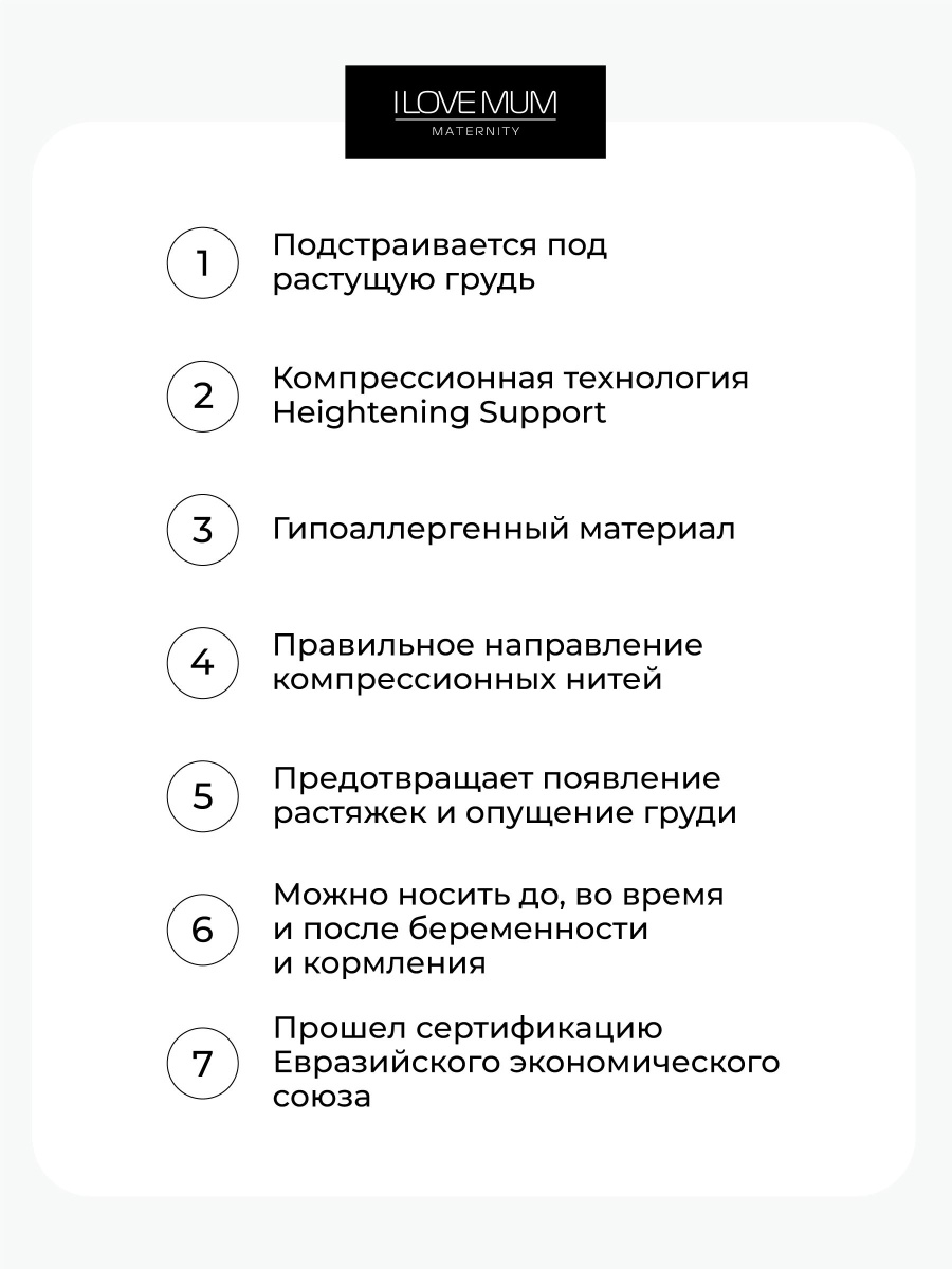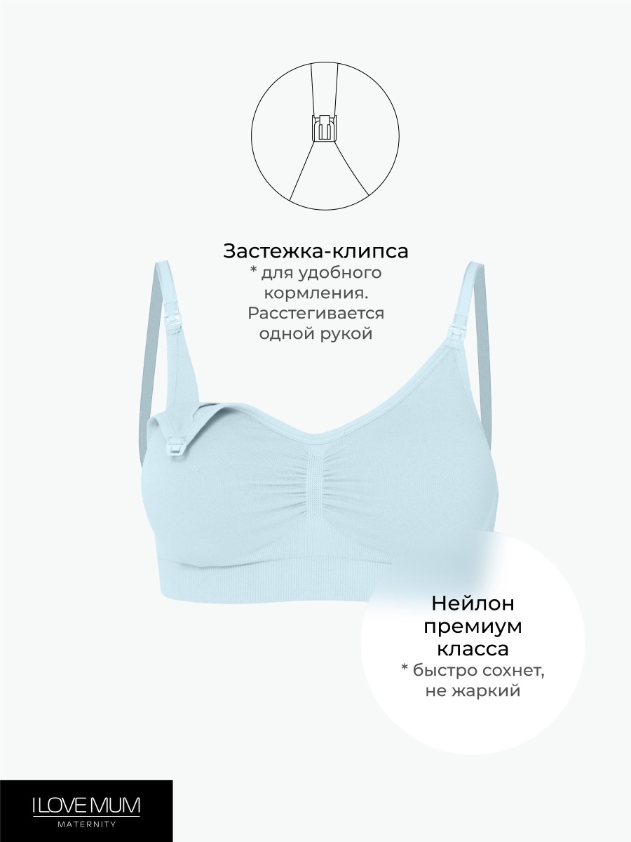 Бюстгальтер для кормления Кэндис - самая популярная модель бесшовного женского дородового и послеродового нижнего белья бренда I LOVE MUM. Выполнен из высококачественного , гипоаллергенного, отлично тянущегося нейлона премиального качества. Нейлон выводит влагу и быстро сохнет в отличие от бюстгальтера для кормления хлопок. Нижнее белье для кормящих можно использовать как в дородовой период, так и в послеродовой, идеально на выписку из роддома. Мягкие чашки без косточек с круговой поддержкой деликатно фиксируют грудь, не сдавливая её, и создают эффект пуш ап. Бесшовный топ для беременных и кормящих мам с секретными застежками на чашечках позволяет быстро и с удобством покормить малыша. При регулярном ношении в период беременности лиф на бретелях предотвращает мастит и растяжки на груди большого размера. Мягкий дышащий материал и анатомический крой позволяют носить трикотажный лифчик во время занятий спортом под спортивной одеждой.