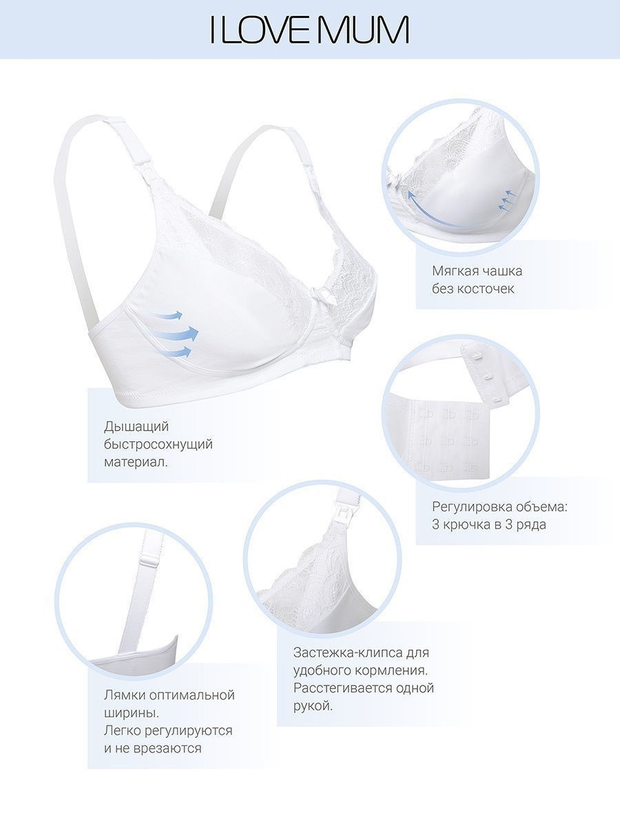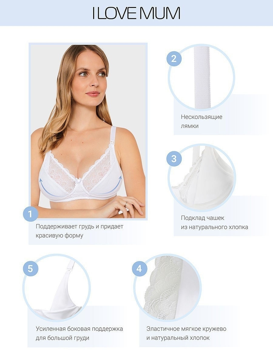Женственный и практичный бюстгальтер для кормления "Джулия" влюбляет с первого взгляда и прикосновения. Обладает приятной телу мягкостью трикотажа и функциональным кроем. Модный бюстгальтер без косточек идеален для любого триместра беременности. Надежно поддерживает грудь, но не давит. Качественное нижнее женское белье именитого бренда - это лучший топ для кормящих мам, в нем удобно кормить малыша, чувствуя себя привлекательной. Бюстгальтер выполнен из гипоаллергенного хлопка с эластанном, декорирован изящным кружевом. Кожа в лифе для кормления из хлопка дышит. Лифчик для беременных с секретными застежками можно расстегнуть одной рукой, покормив ребенка с максимальным комфортом дома и на улице. Купите бюстгальтер в роддом или для повседневной носки, дополнив комплект трусиками в тон. Белье для беременных и кормящих не потеряет форму после многочисленных стирок. Это именно тот лифчик для кормящих мам и женщин в прекрасном положении, который вы искали. Спасибо I LOVE MUM!
