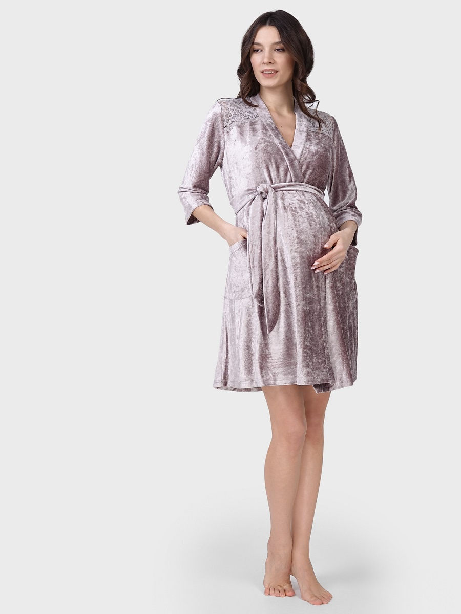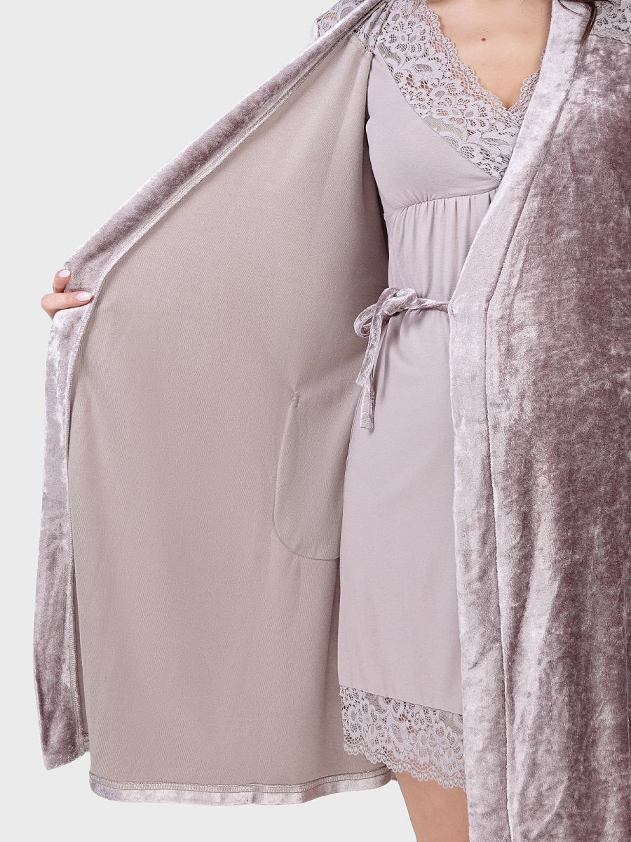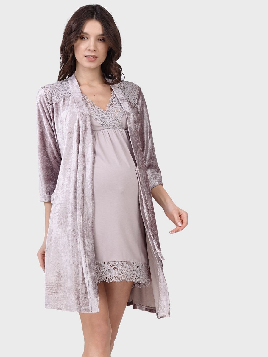 Велюровый комплект для роддома I love mum для беременных и кормящих. В комплекте: халат, сорочка. Ткань: халат - велюр; сорочка - вискоза, эластичное кружево. Для удобства кормления достаточно отогнуть верхнюю часть лифа на сорочке. Длина халата по спинке: 94 см. Два боковых кармана на халате. Длина рукава: 43 см. Длина сорочки по спинке: 80 см.