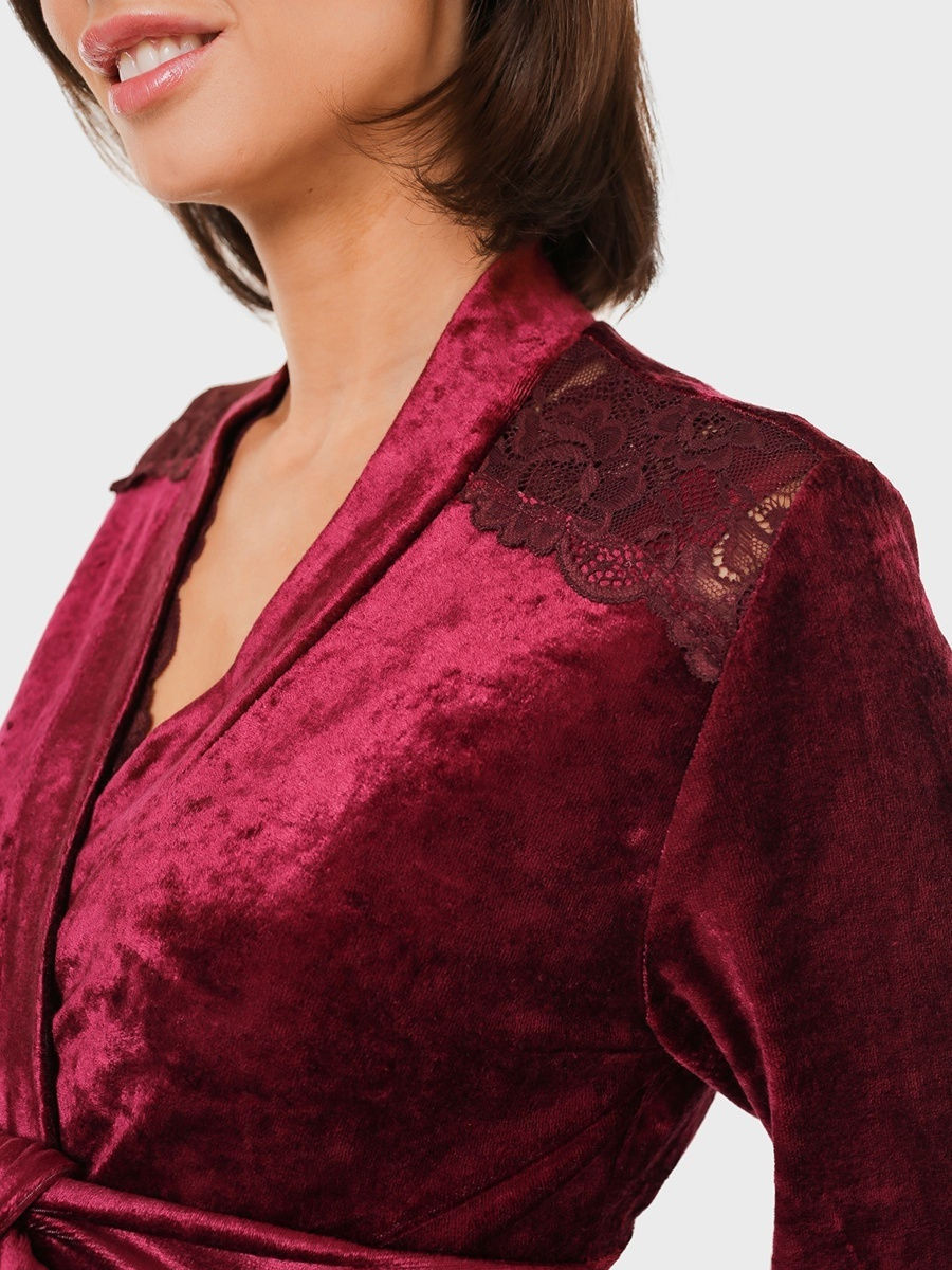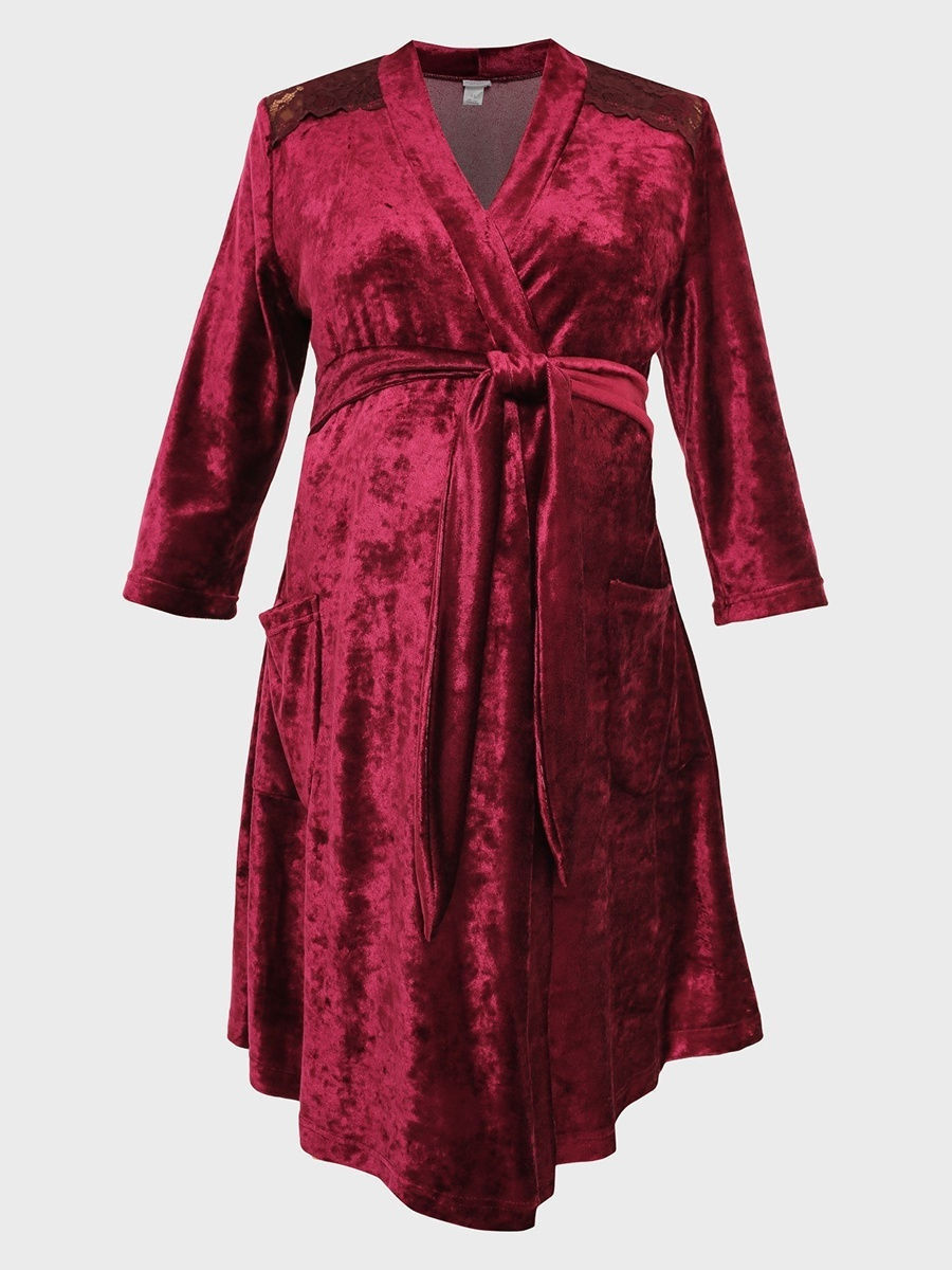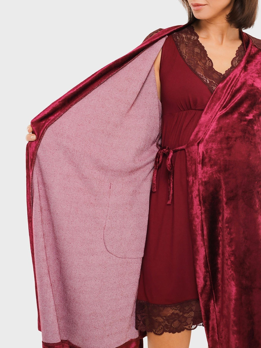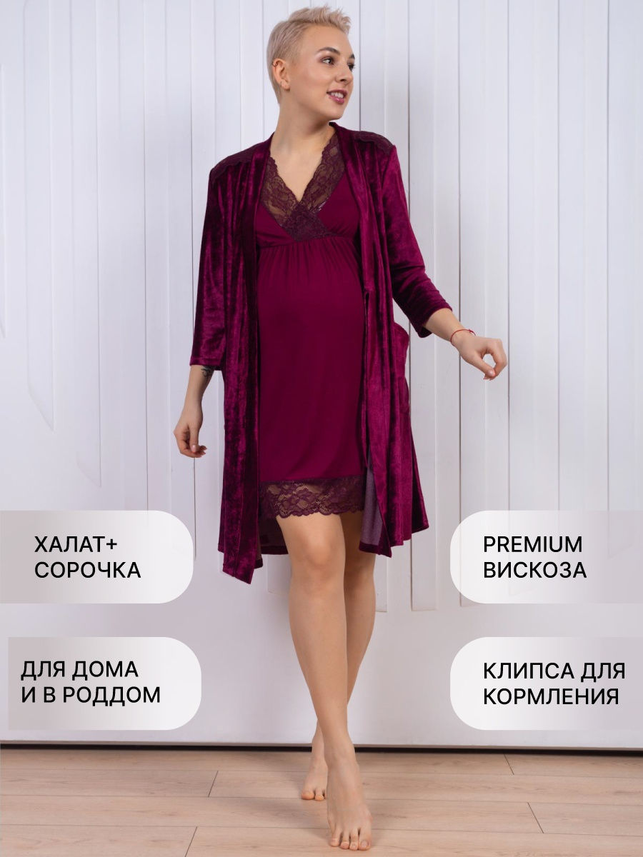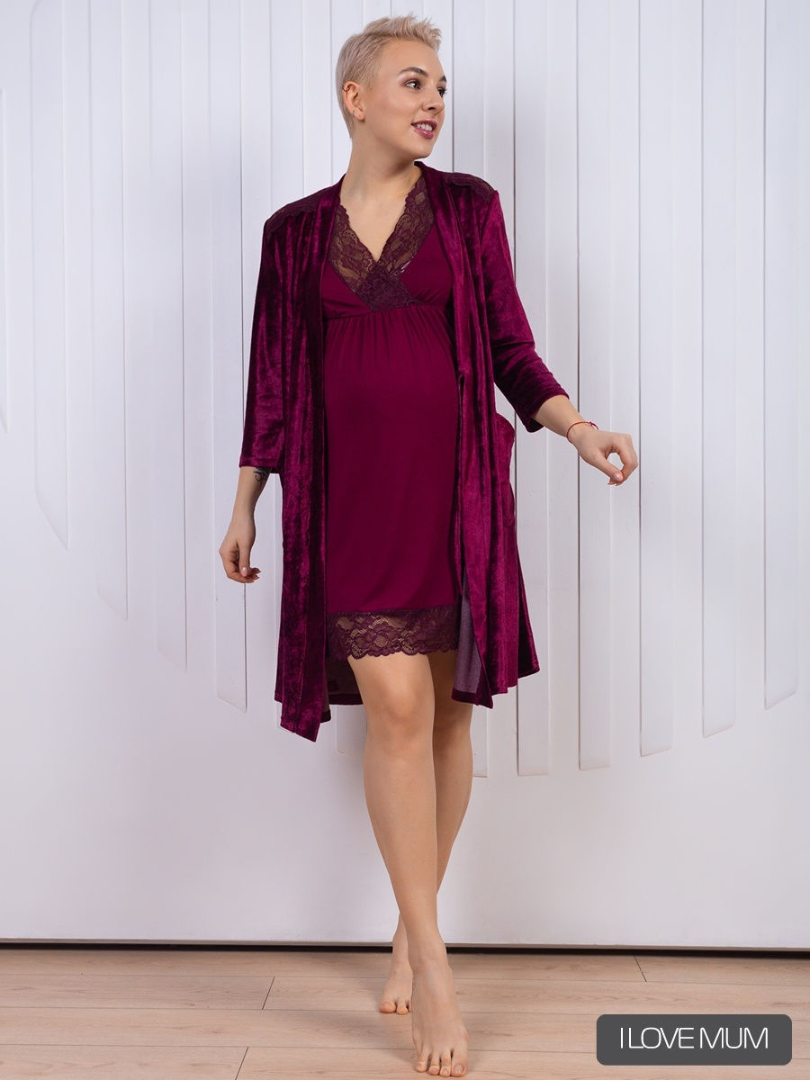 Велюровый комплект для роддома I love mum для беременных и кормящих. В комплекте: халат, сорочка. Ткань: халат - велюр; сорочка - вискоза, эластичное кружево. Для удобства кормления достаточно отогнуть верхнюю часть лифа на сорочке. Длина халата по спинке: 94 см. Два боковых кармана на халате. Длина рукава: 43 см. Длина сорочки по спинке: 80 см.