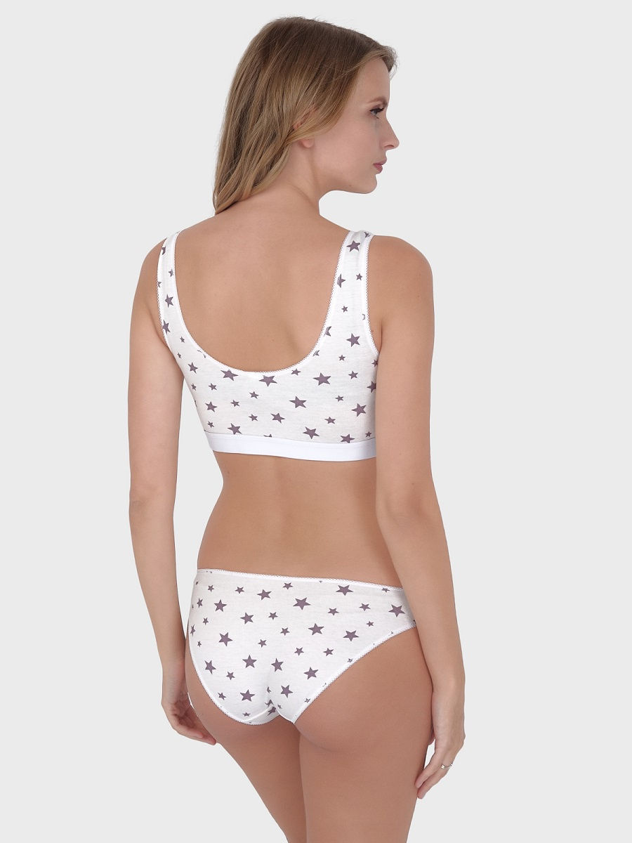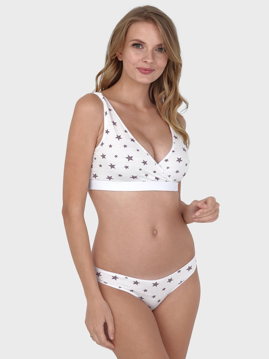 Трикотажный комплект белья для беременных и кормящих состоит из топа для кормления и трусиков из 100% мягкого хлопкового трикотажа. Чашечка бюстгальтера для кормления мягкая, без косточек, комфортная. Удобство кормления: достаточно отогнуть мягкую чашечку лифа. Швы на лифчике и трусах гладкие, незаметны под одеждой.Комплект белья универсален, его можно носить как до, во время, так и после беременности. Комплект белья для беременный и кормящих - станет прекрасным подарком будущей маме, жене, подруге или себе.