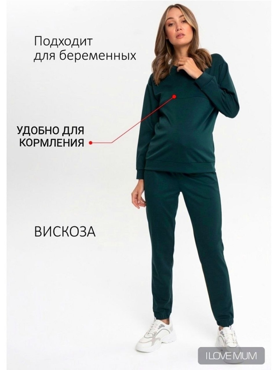 Спортивный трикотажный костюм для беременных и кормления из вискозы (джерси). В комплекте: джемпер с секретом кормления на потайной молнии, брюки джоггеры с резинкой на щиколотке и боковыми карманами. Удобный и практичный костюм для будущих мам и кормящих женщин подойдет на весь срок беременности, а так же станет удобной повседневной одеждой в послеродовой период. Свитер с потайной молнией для кормления позволит вам вести активный образ жизни и при этом не разлучаться с малышом. Так же женский костюм удобно взять в роддом, или носить дома (домашняя одежда женская). Удобство кормления: потайная горизонтальная молния. Длина по спинке: 60 см. Длина рукава: 64 см. Длина по внутреннему шву: 72 см. Карманы: боковые с отрезным бочком. Рекомендации по уходу: деликатная стирка в стиральной машине при 30C.