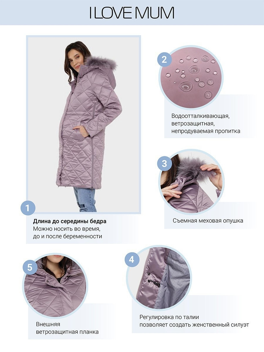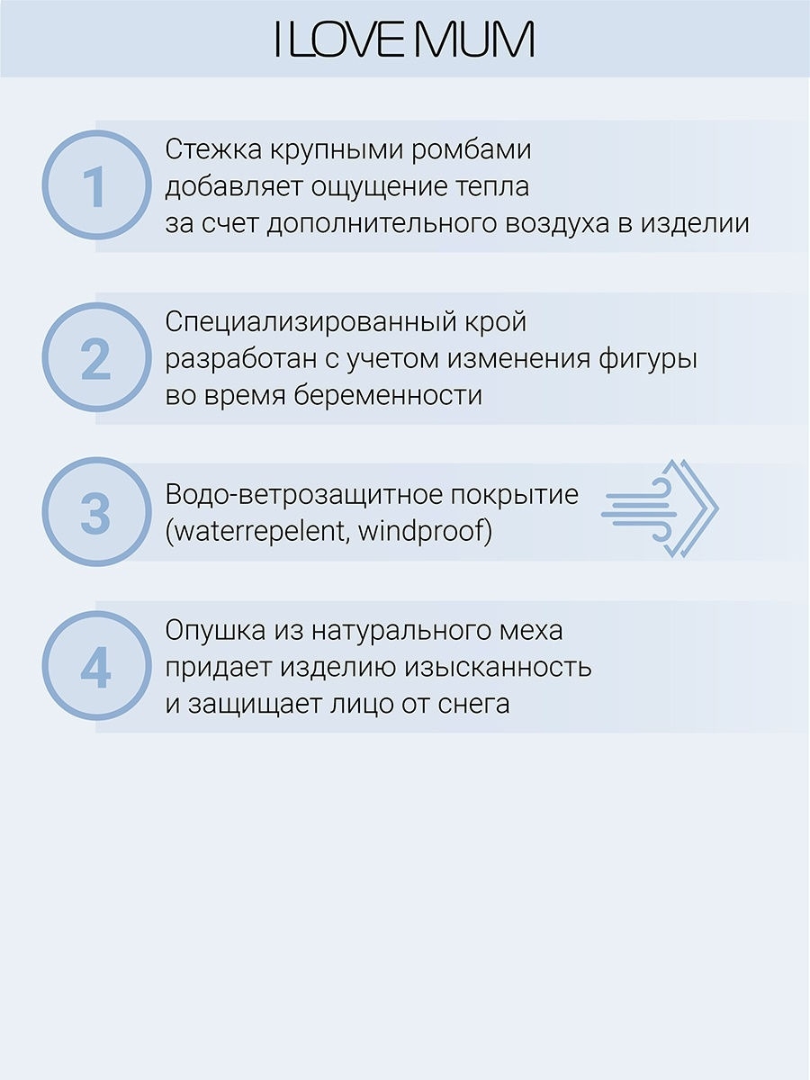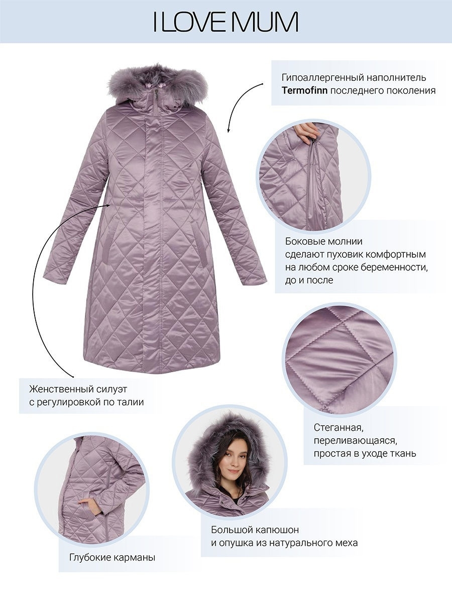 Тип 2в1: для беременных, обычная. В комплекте: куртка с запасом на живот. Объем для живота увеличивается за счет боковых молний. Дополнительные вставки: нет. Материал: курточная ткань. Утеплитель: термофин (250 гр/м2). Капюшон: не отстегивается. Опушка: натуральный мех енота, отстегивается (на молнии). Карманы: два боковых открытых кармана . Длина по спинке: 96 см. Длина рукава: 65 см.