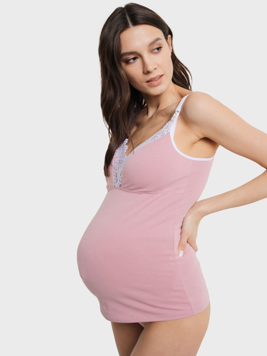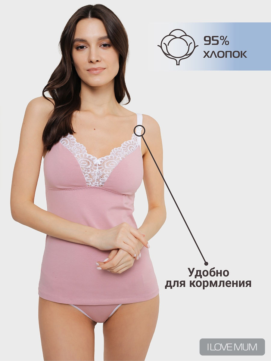 Майка I love mum для беременных и кормящих из хлопкового трикотажа и эластичного кружева. Бретели: классические, с регулировкой; ширина 14 мм. Удобство кормления: застежка-клип на каждой бретели. Длина по спинке: 46 см. (без учёта лямок). Вы можете дополнить майку Дольче трусиками, ночной сорочкой, пижамой или комплектом для роддома из коллекции "Дольче".