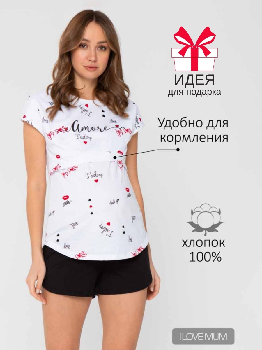 Домашний трикотажный костюм I love mum для беременных обладает уникальным кроем, станет незаменимой одеждой для будущих мам. В такой пижаме для кормления грудью намного проще покормить малыша, чем в случае с классическими брючными комбинезонами, футболками, майками и кигуруми. Пижама женская для кормящих мам из натурального хлопка невероятно удобна, будет активно использоваться во время беременности. Топик со штанами уместны даже когда животик приобретет большие размеры. Модный домашний комплект пригодится после рождения ребенка, его можно взять с собой в роддом. Майка с секретом, обеспечивающим доступ к груди, идеальна для сна, пояс у шорт сделан под живот. Домашняя пижама с принтом и шортами, станет лучшим решением в подарок на день святого валентина 14 февраля и к 8 марта жене девушке сестре маме подруге любимой. Низ можно заменить любыми шортами или на стильный комбез. Легкая, раздельная и молодежная футболка с шортами обязательно будет использоваться в повседневной жизни.