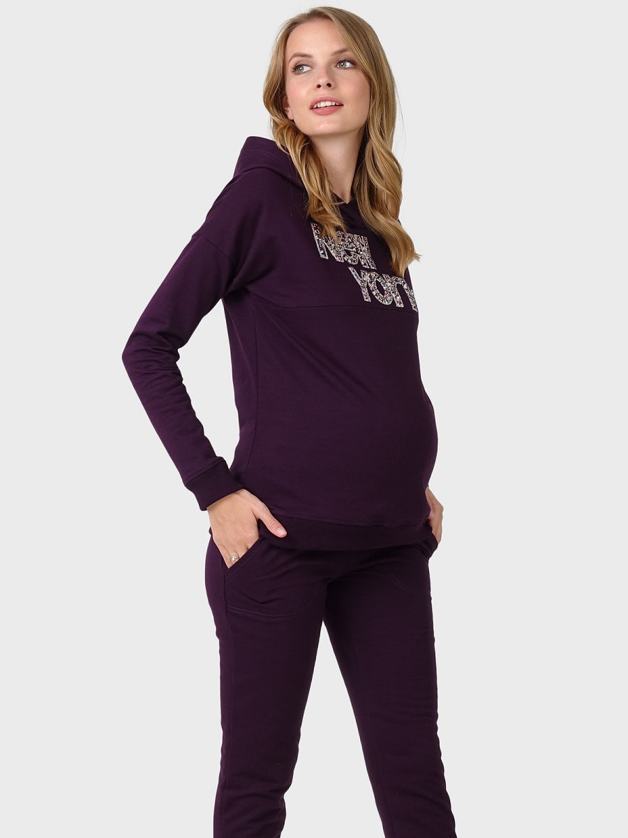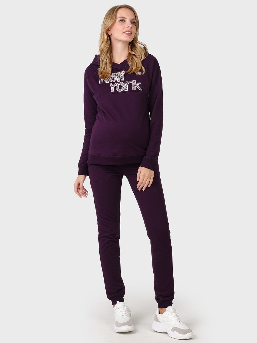 Спортивный трикотажный костюм I love mum для беременных и кормящих. Стильный брючный костюм выполнен из неэластичного футера с начесом с изнанки. Удобство кормления: потайная горизонтальная молния. Карманы присутствуют только на брюках - боковые. Пояс брюк: высокая эластичная вставка на живот.