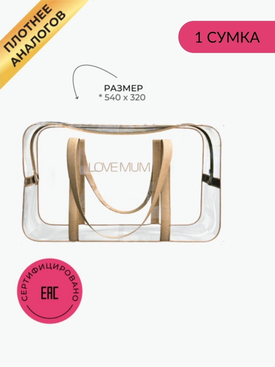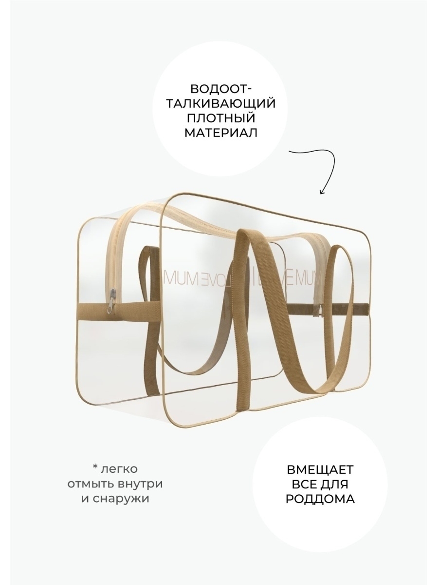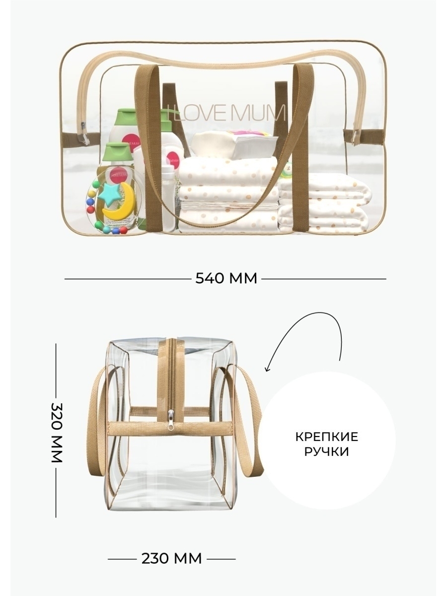 Сумки в роддом прозрачные I Love mum надежные и прочные, выполнены из сертифицированный морозоустойчивой ПВХ-пленки, с усиленными боковыми швами и крепкими ручками. Все необходимые вещи для мамы и малыша с легкостью поместятся в них. С нашими вместительными сумками, вы сможете комфортно провести первые дни в роддоме, а в дальнейшем использовать их при посещении СПА, фитнеса, в отпуске, поездке или путешествии. Благодаря водоотталкивающим свойствам материала, сумки могут использоваться для мокрых вещей и станут незаменимым аксессуаром для похода в бассейн, баню, сауну и на пляж. Комплект сумок в роддом представлен в разных цветах и размерах, что позволяет будущей маме подобрать оптимальный для себя вариант:
