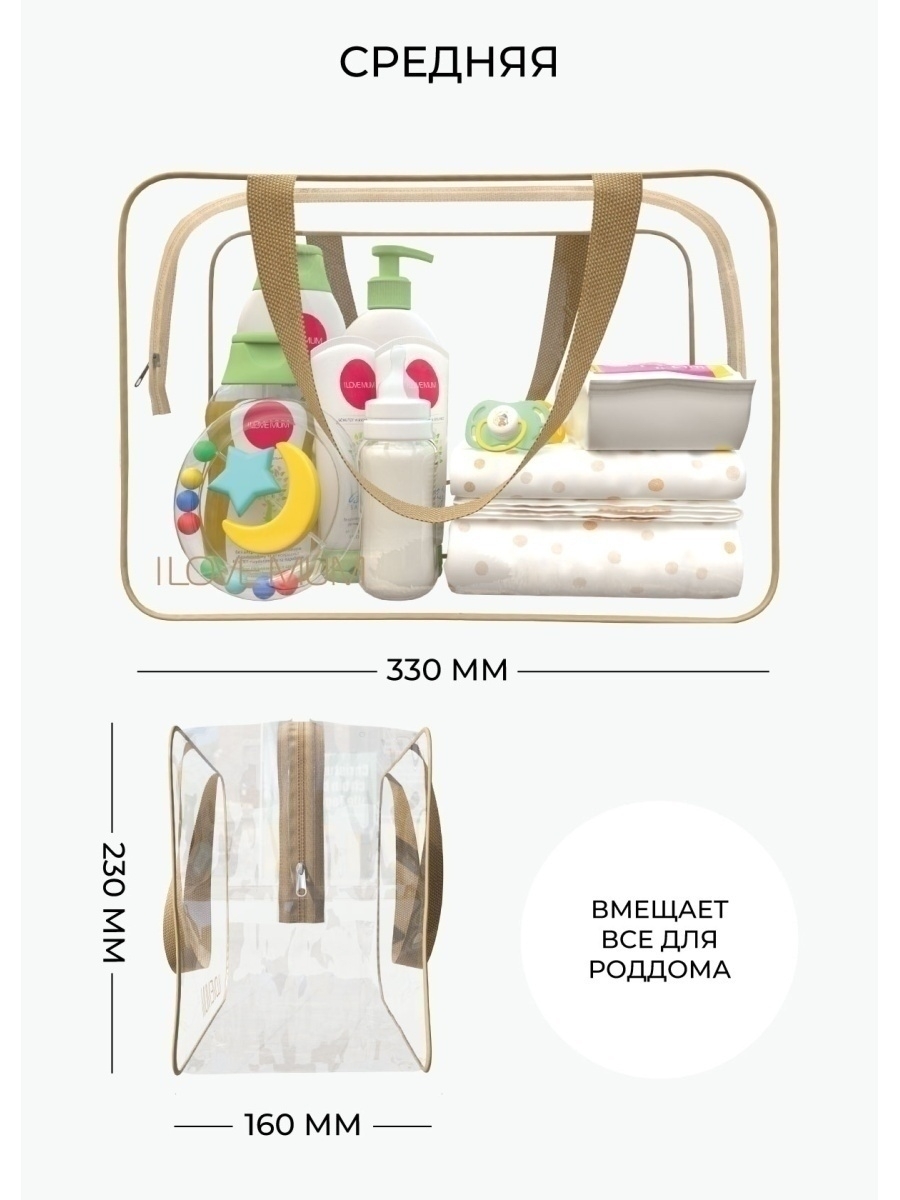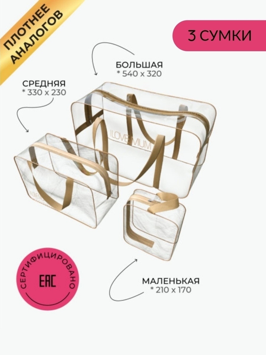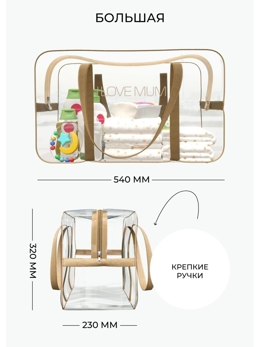 Сумки в роддом прозрачные I Love mum надежные и прочные, выполнены из сертифицированный морозоустойчивой ПВХ-пленки, с усиленными боковыми швами и крепкими ручками. Все необходимые вещи для мамы и малыша с легкостью поместятся в них. С нашими вместительными сумками, вы сможете комфортно провести первые дни в роддоме, а в дальнейшем использовать их при посещении СПА, фитнеса, в отпуске, поездке или путешествии. Благодаря водоотталкивающим свойствам материала, сумки могут использоваться для мокрых вещей и станут незаменимым аксессуаром для похода в бассейн, баню, сауну и на пляж. Комплект сумок в роддом представлен в разных цветах и размерах, что позволяет будущей маме подобрать оптимальный для себя вариант: