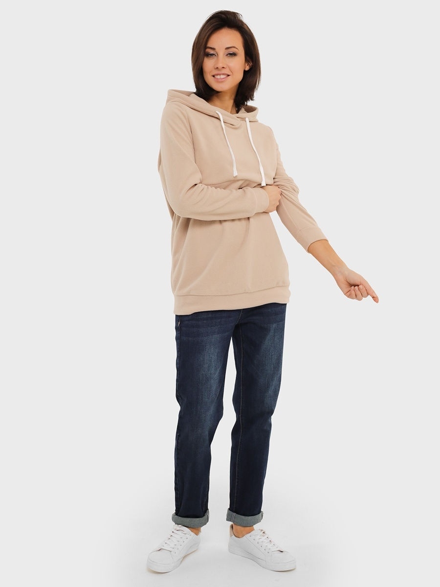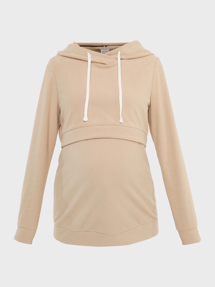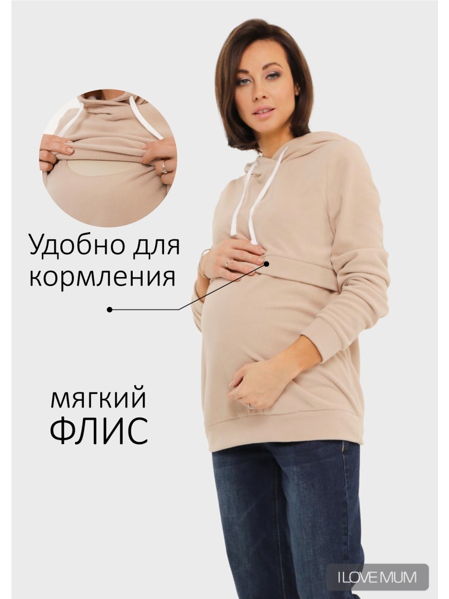 Базовая комфортная и уютная толстовка для беременных и кормящих. Свитшот с капюшоном полуприлегающего силуэта из флиса - очень мягкая и приятная в носке ткань, отводит излишнюю влагу и сохраняет тепло, обеспечивая внутренний комфорт телу. Толстовка сконструирована с учетом постепенного увеличения живота. Подходит для ношения с самых ранних сроков и до конца беременности. Для комфортного и незаметного кормления предусмотрен двуслойный подрез под грудью. Толстовка будет удобна на любом сроке беременности, а также после беременности во время кормления. Длина изделия по спинке: 68 см. Длина рукава: 62 см. Карманы: нет. Рекомендации по уходу: бережная ручная или машинная стирка при температуре 30С.